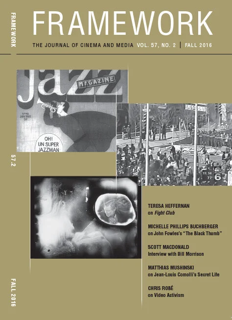Situate. This is a focus in Framework vol. 57, no. 2, as each author concentrates on newly situating their subjects. Besides the topics themselves—jazz, French film criticism, video history, adaptations, and experimental cinema—the writers’ examination of small details in these subjects that are not typically examined is fascinating. The writers ask questions: How are these facts and ideas situated in our culture, and why would we look at them? How do they fit into a longer view? Teresa Heffernan’s “When the Movie Is Better Than the Book: Fight Club, Consumption, and Vital Signs” examines the film Fight Club as “better than the book” and digs into reasons that go beyond a comparison of content, positing that answers lie in why “origins and sources . . . should continue to haunt adaptation theory.” In “The Film That Almost Was: John Fowles’s ‘The Black Thumb’ and His Collaboration with David Tringham,” also about novel-film adaptation, Michelle Phillips Buchberger links the screen work of novelist John Fowles, whose writing dominated some important films of the 1960s and 1980s, to his struggles with the studio machine. Matthias Mushinski, in his detailed essay, “Jean-Louis Comolli’s Secret Life as a Free Jazz Critic/Thinking Free Jazz as an Avant-Garde of the Masses,” uncovers jazz influences in 1950s French film criticism. Christopher Robé’s “Criminalizing Dissent: Western State Repression, Video Activism, and Counter-Summit Protests” reveals an involved and persistent history of video activism, through an analysis of specific moments, which, he argues, have a key importance and are precursors to major movements today, such as Black Lives Matter. Scott MacDonald’s interview with the “Orpheus of Nitrate,” Bill Morrison, looks closely at the lesser-known world of Morrison’s filmmaking origins, discussing how Morrison developed his ability to take a tiny detail in celluloid footage and re-situate it, allowing the viewer to see it differently.